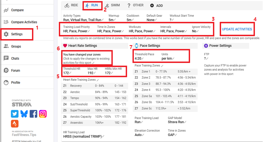 - Click the yellow notice that says "You have changed your zones" to apply changes to existing activities